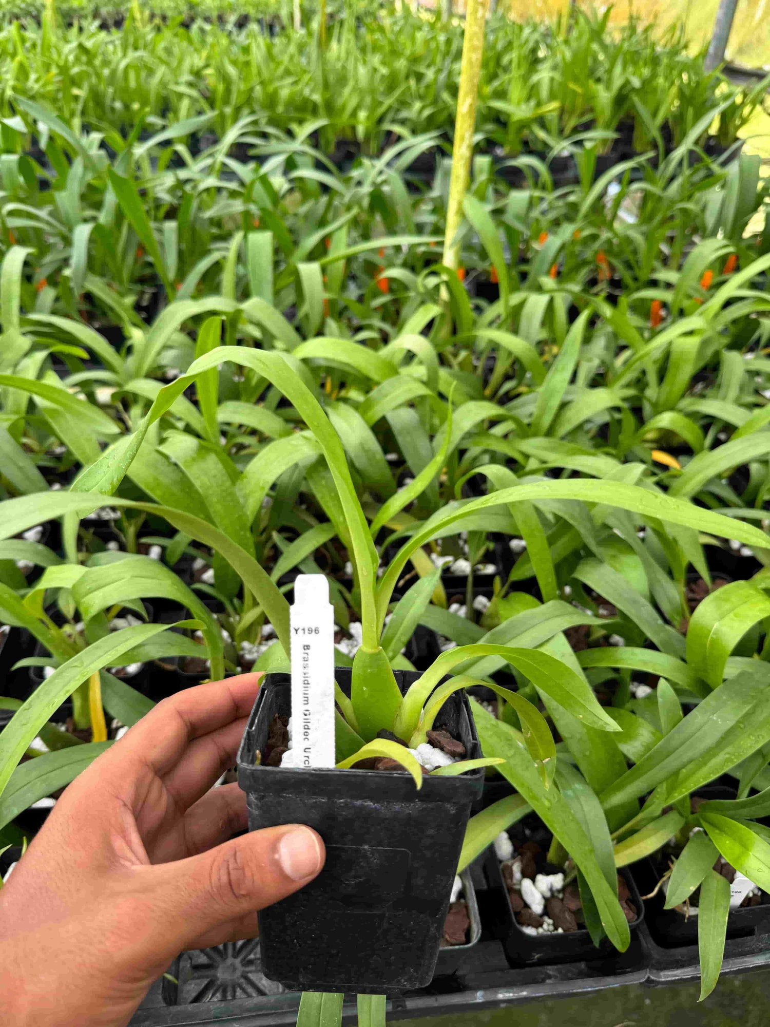 Turn heads with this dramatic and exotic orchid! Brassidium Gilded Urchin ‘Ontario’ is a hybrid of Brassia (spider orchid) and Oncidium, producing striking star-like blooms with long, slender petals in bright yellow, often boldly marked with chocolate or deep red spotting.